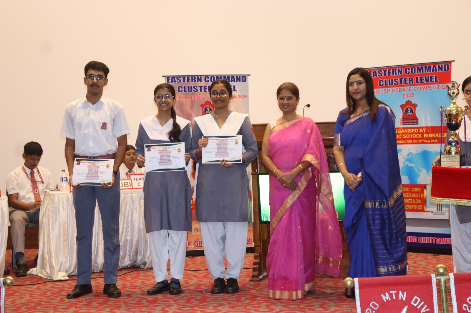 - Eastern Command Inter APS Cluster level Debate Competition was hosted by APS Binnaguri on 22 September 2025, at Samra Auditorium, featuring teams from the Cluster: APS Kolkata, APS Sukna, APS Barrackpore APS Bengdubi, APS Binnaguri and APS Ranchi. The event was graced by Mrs. Purvi Bhushan as the Chief Guest and the Guest of Honour Lt. Col. Nirmal Kumar Panda. The School Debate Team members comprised ofRiddhima Majawadia of XI Humanities, Shivoham Mishra of XI Science and Samriddhi Chanda of XI Humanities. After an intense face-off, APS Binnaguri emerged as the Champions, followed by APS Kolkata and APS Sukna in second and third places, respectively. Riddhima Majawadia of class XI Humanities was adjudged the Best Speaker, and Samriddhi Chanda the Best Interjector. After the prize distribution, the event concluded with motivational words from the Chief Guest Mrs Purvi Bhushan and words of gratitude and encouragement from Mrs. Kiran Singh, Principal APS Binnaguri. It was indeed a proud moment for APS Binnaguri.